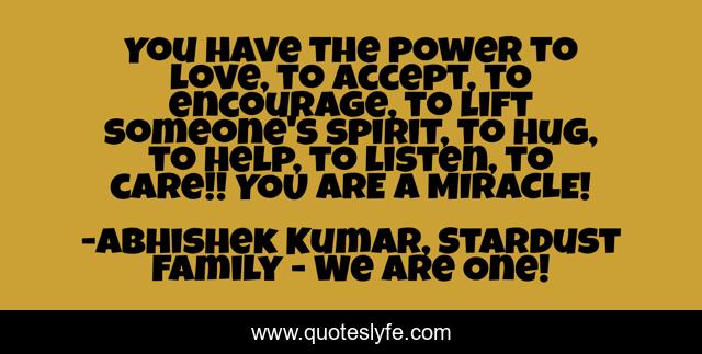 This page presents the quote "You have the power to love, to accept, to encourage, to lift someone's spirit, to hug, to help, to listen, to care!! YOU ARE A MIRACLE!". Author of this quote is Abhishek Kumar, Stardust Family - We Are One!. This quote is about you-are-a-miracle, hug, help, abhishek-kumar, abhishek-kumar-india, power-to-love, listen, care,.