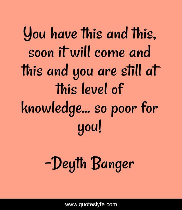 This page presents the quote "You have this and this, soon it will come and this and you are still at this level of knowledge... so poor for you!". Author of this quote is Deyth Banger. This quote is about poor, wow, knowledge, for, soon,.