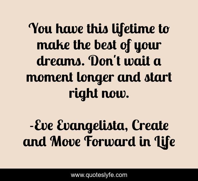 This page presents the quote "You have this lifetime to make the best of your dreams. Don't wait a moment longer and start right now.". Author of this quote is Eve Evangelista, Create and Move Forward in Life. This quote is about life, love, successful-mind, affection, inspirational, enthusiasm, dreams,.