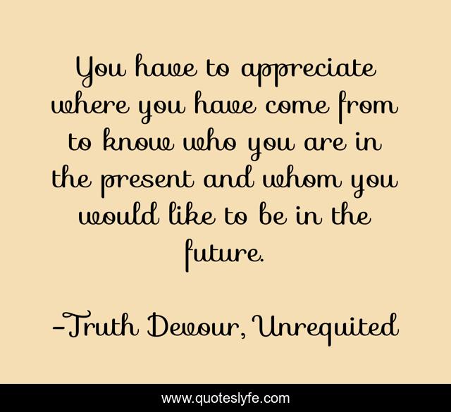 "Truth Devour, Unrequited Quotes." Quoteslyfe.com, 2025. Fri. 05 Dec. 2025. <https://www.quoteslyfe.com/quote/You-have-to-appreciate-where-you-have-16880>.