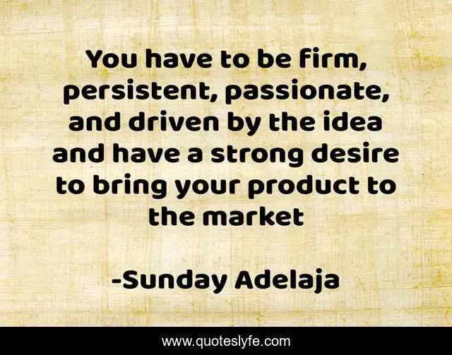 This page presents the quote "You have to be firm, persistent, passionate, and driven by the idea and have a strong desire to bring your product to the market". Author of this quote is Sunday Adelaja. This quote is about desire, firm, product, passionate, purpose, calling, persistent, idea, driven,.