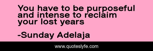 This page presents the quote "You have to be purposeful and intense to reclaim your lost years". Author of this quote is Sunday Adelaja. This quote is about love, pragmatic, consciousness, people, money, principles, selflessness, intensity, employment,.