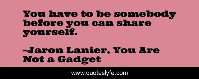 This page presents the quote "You have to be somebody before you can share yourself.". Author of this quote is Jaron Lanier, You Are Not a Gadget. This quote is about sharing, character, personality,.