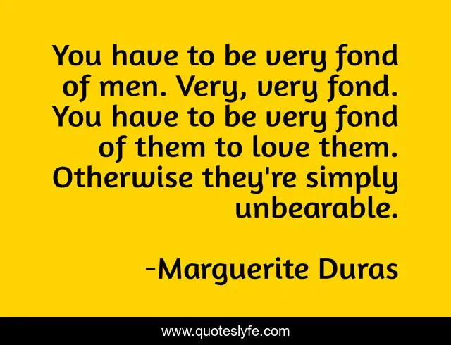 This page presents the quote "You have to be very fond of men. Very, very fond. You have to be very fond of them to love them. Otherwise they're simply unbearable.". Author of this quote is Marguerite Duras. This quote is about men, love, affection,.