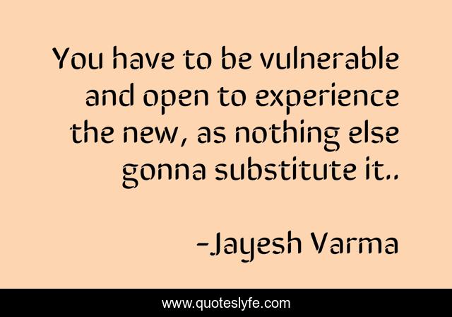 This page presents the quote "You have to be vulnerable and open to experience the new, as nothing else gonna substitute it..". Author of this quote is Jayesh Varma. This quote is about openness, vulnerability, experience, substitute,.