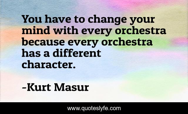 This page presents the quote "You have to change your mind with every orchestra because every orchestra has a different character.". Author of this quote is Kurt Masur. This quote is about character, mind,.