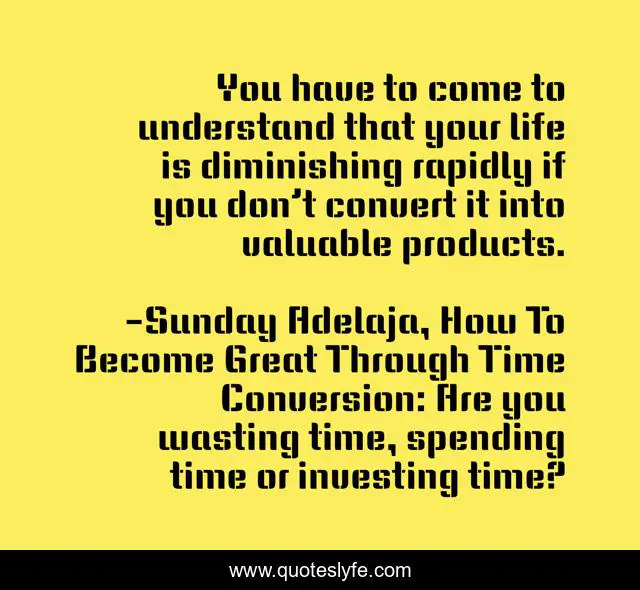 This page presents the quote "You have to come to understand that your life is diminishing rapidly if you don’t convert it into valuable products.". Author of this quote is Sunday Adelaja, How To Become Great Through Time Conversion: Are you wasting time, spending time or investing time?. This quote is about life, diminishing-life, conversion, productivity, wealth, greatness, waste, humanity, diminishment,.