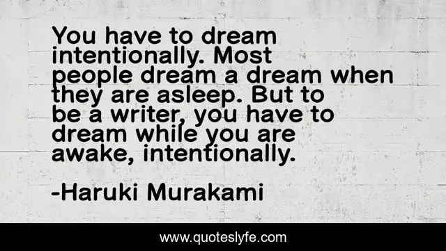 This page presents the quote "You have to dream intentionally. Most people dream a dream when they are asleep. But to be a writer, you have to dream while you are awake, intentionally.". Author of this quote is Haruki Murakami. This quote is about writers-on-writing, writers, writing,.