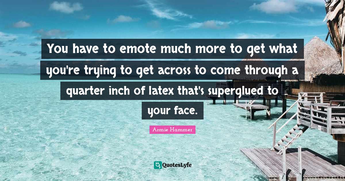 This page presents the quote "You have to emote much more to get what you're trying to get across to come through a quarter inch of latex that's superglued to your face.". Author of this quote is Armie Hammer. This quote is about your face, faces, emote, trying, latex,.