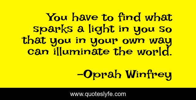 This page presents the quote "You have to find what sparks a light in you so that you in your own way can illuminate the world.". Author of this quote is Oprah Winfrey. This quote is about light, spark, illuminate, world, oprah,.