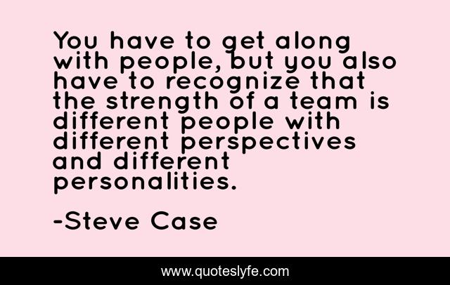This page presents the quote "You have to get along with people, but you also have to recognize that the strength of a team is different people with different perspectives and different personalities.". Author of this quote is Steve Case. This quote is about team, people,.