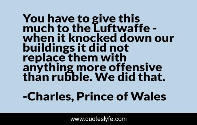 This page presents the quote "You have to give this much to the Luftwaffe - when it knocked down our buildings it did not replace them with anything more offensive than rubble. We did that.". Author of this quote is Charles, Prince of Wales. This quote is about architecture, architects,.