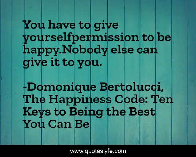 This page presents the quote "You have to give yourselfpermission to be happy.Nobody else can give it to you.". Author of this quote is Domonique Bertolucci, The Happiness Code: Ten Keys to Being the Best You Can Be. This quote is about life-coaching, motivation, how-to-be-happier, life-coach, be-happy, how-to-be-happy, happiness-advice, happiness, be-more-motivated,.