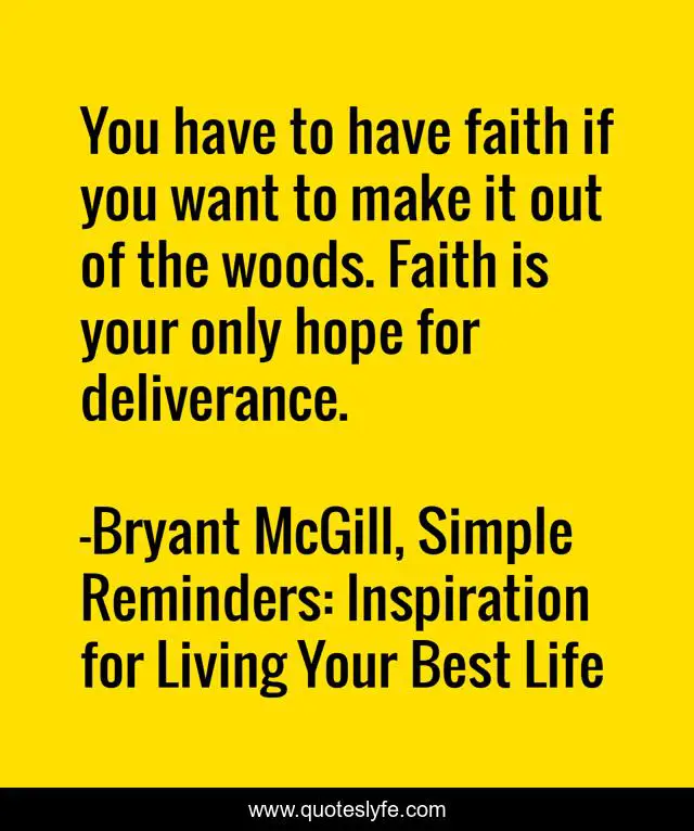 This page presents the quote "You have to have faith if you want to make it out of the woods. Faith is your only hope for deliverance.". Author of this quote is Bryant McGill, Simple Reminders: Inspiration for Living Your Best Life. This quote is about faith, growth, deliverance, hope,.