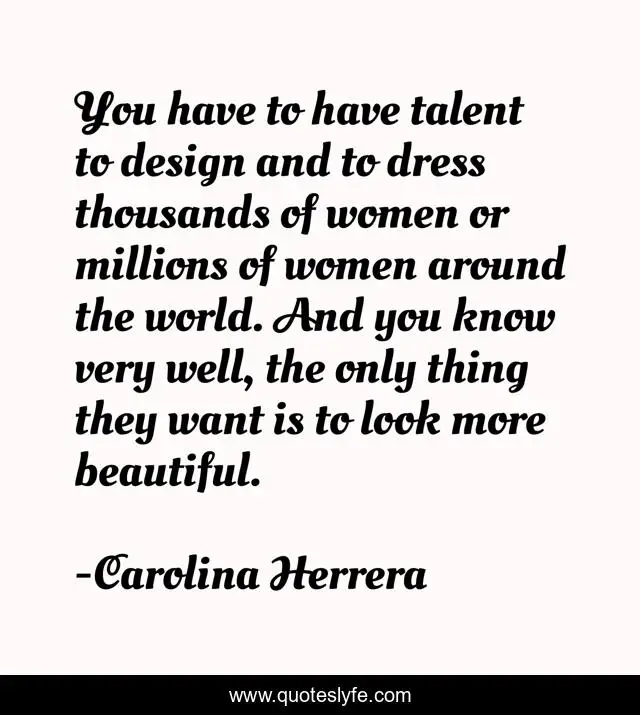 This page presents the quote "You have to have talent to design and to dress thousands of women or millions of women around the world. And you know very well, the only thing they want is to look more beautiful.". Author of this quote is Carolina Herrera. This quote is about beautiful, world, women,.