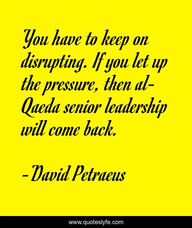 This page presents the quote "You have to keep on disrupting. If you let up the pressure, then al-Qaeda senior leadership will come back.". Author of this quote is David Petraeus. This quote is about pressure, senior,.