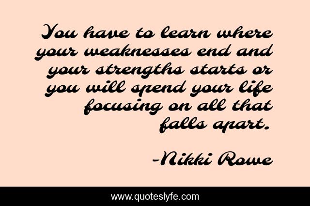 This page presents the quote "You have to learn where your weaknesses end and your strengths starts or you will spend your life focusing on all that falls apart.". Author of this quote is Nikki Rowe. This quote is about warrior, awaken, strength, wise, mindfulness, becoming, insight, wisdom, courage,.