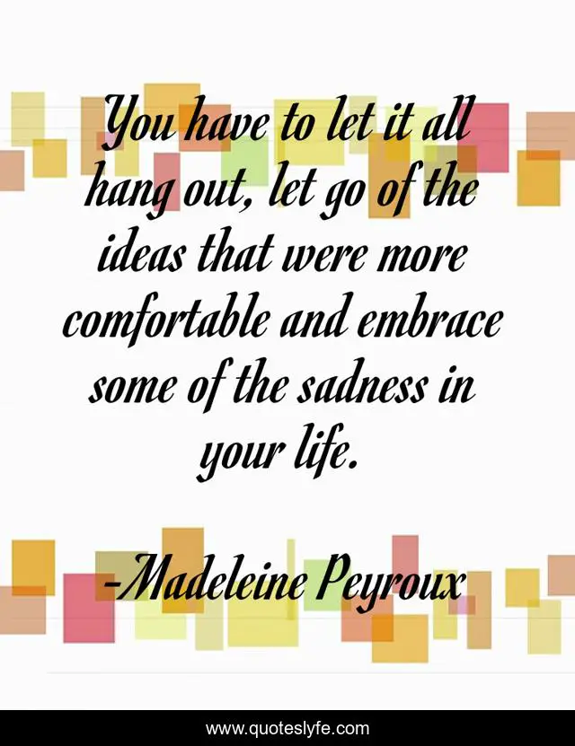 This page presents the quote "You have to let it all hang out, let go of the ideas that were more comfortable and embrace some of the sadness in your life.". Author of this quote is Madeleine Peyroux. This quote is about life, sadness, ideas,.