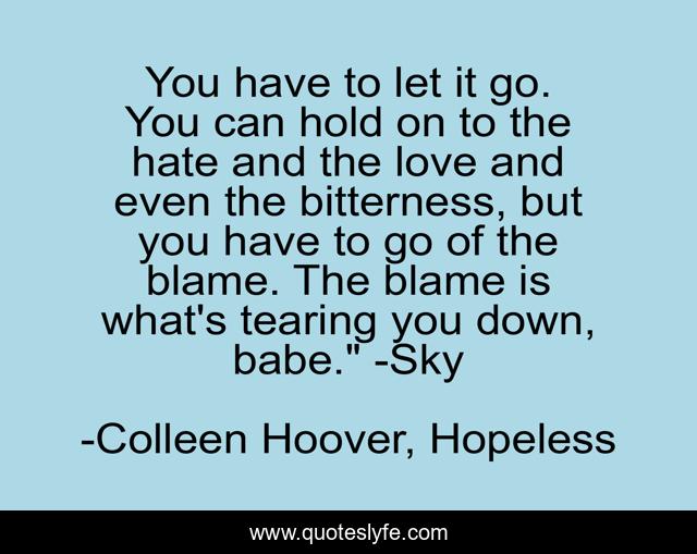 This page presents the quote "You have to let it go. You can hold on to the hate and the love and even the bitterness, but you have to go of the blame. The blame is what's tearing you down, babe." -Sky". Author of this quote is Colleen Hoover, Hopeless. This quote is about holder, sky, self-blame,.