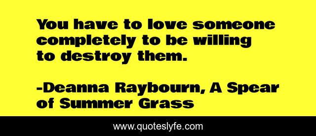 This page presents the quote "You have to love someone completely to be willing to destroy them.". Author of this quote is Deanna Raybourn, A Spear of Summer Grass. This quote is about love, affection, destruction,.