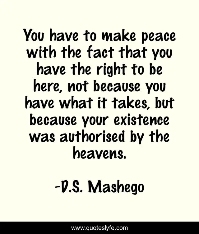 This page presents the quote "You have to make peace with the fact that you have the right to be here, not because you have what it takes, but because your existence was authorised by the heavens.". Author of this quote is D.S. Mashego. This quote is about right, authorised, peace, existence, heavens, fact,.