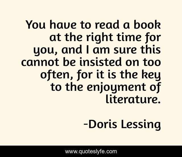 This page presents the quote "You have to read a book at the right time for you, and I am sure this cannot be insisted on too often, for it is the key to the enjoyment of literature.". Author of this quote is Doris Lessing. This quote is about reading-books, choosing-books,.