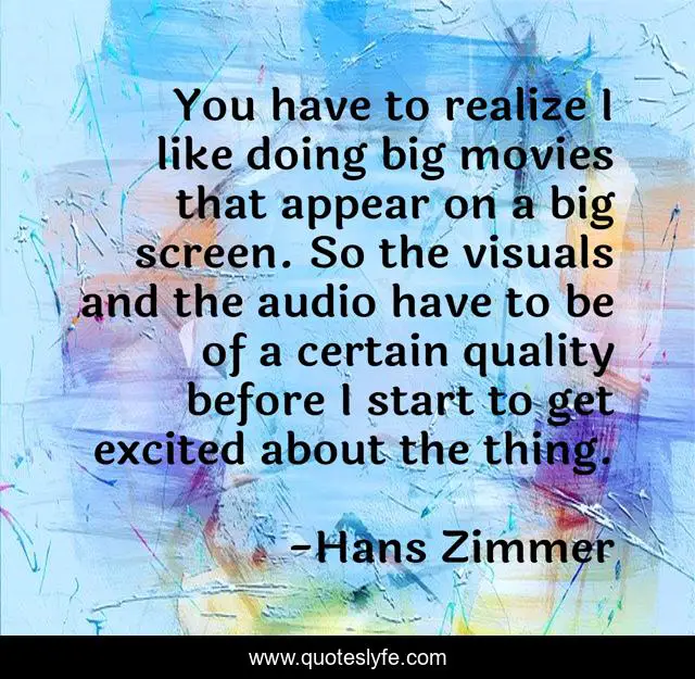 This page presents the quote "You have to realize I like doing big movies that appear on a big screen. So the visuals and the audio have to be of a certain quality before I start to get excited about the thing.". Author of this quote is Hans Zimmer. This quote is about start, quality,.