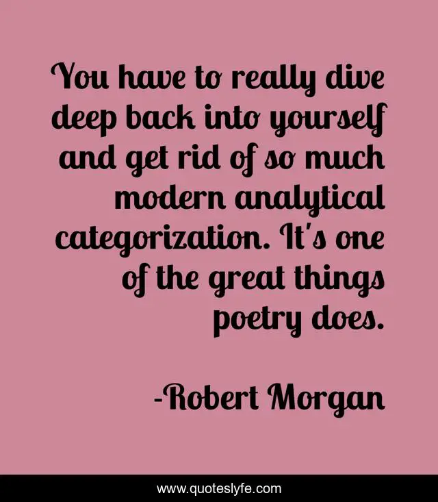 This page presents the quote "You have to really dive deep back into yourself and get rid of so much modern analytical categorization. It's one of the great things poetry does.". Author of this quote is Robert Morgan. This quote is about great, deep, yourself,.