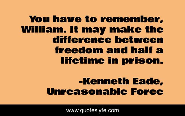 This page presents the quote "You have to remember, William. It may make the difference between freedom and half a lifetime in prison.". Author of this quote is Kenneth Eade, Unreasonable Force. This quote is about remember, prison,.