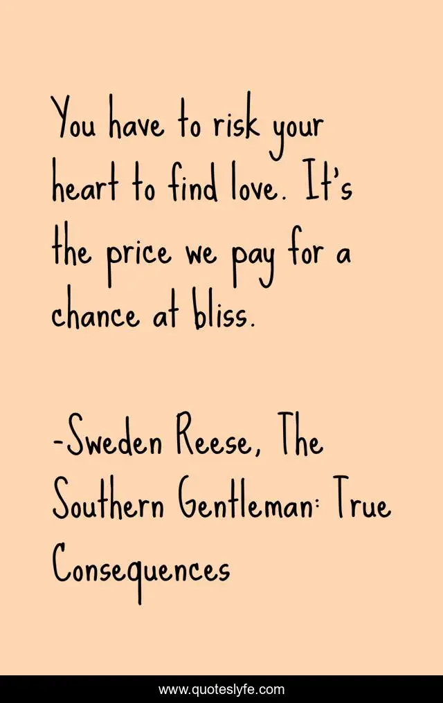This page presents the quote "You have to risk your heart to find love. It’s the price we pay for a chance at bliss.". Author of this quote is Sweden Reese, The Southern Gentleman: True Consequences. This quote is about heart, love, bliss, affection,.