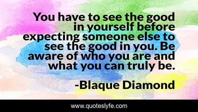 This page presents the quote "You have to see the good in yourself before expecting someone else to see the good in you. Be aware of who you are and what you can truly be.". Author of this quote is Blaque Diamond. This quote is about life, peace, love, success, power, positive, motivational, confidence, encouragement,.
