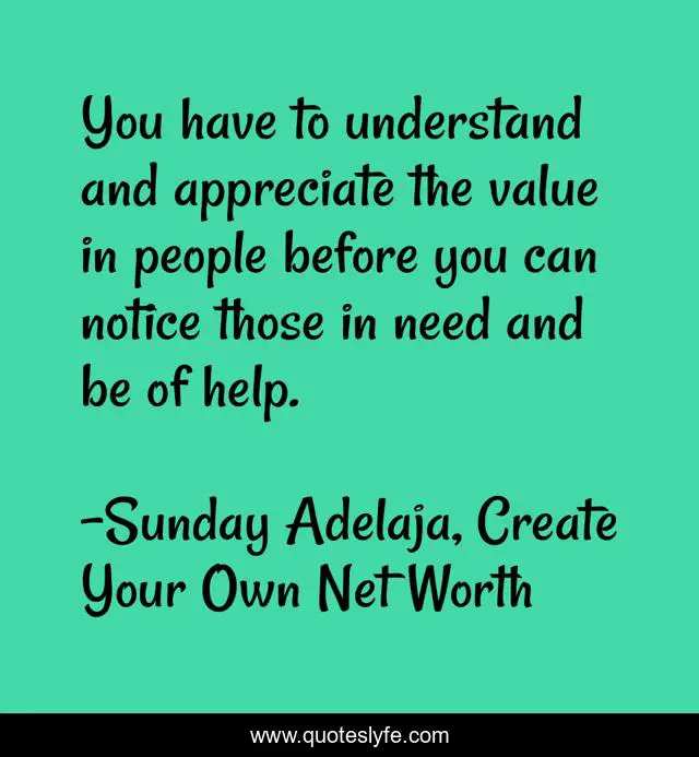 This page presents the quote "You have to understand and appreciate the value in people before you can notice those in need and be of help.". Author of this quote is Sunday Adelaja, Create Your Own Net Worth. This quote is about life, self-image, help, nature, god, understanding-people, people, value, self-worth,.
