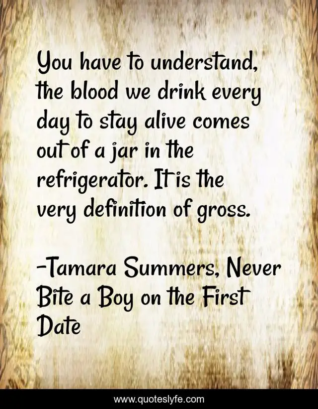 This page presents the quote "You have to understand, the blood we drink every day to stay alive comes out of a jar in the refrigerator. It is the very definition of gross.". Author of this quote is Tamara Summers, Never Bite a Boy on the First Date. This quote is about vampire, drinking-blood,.