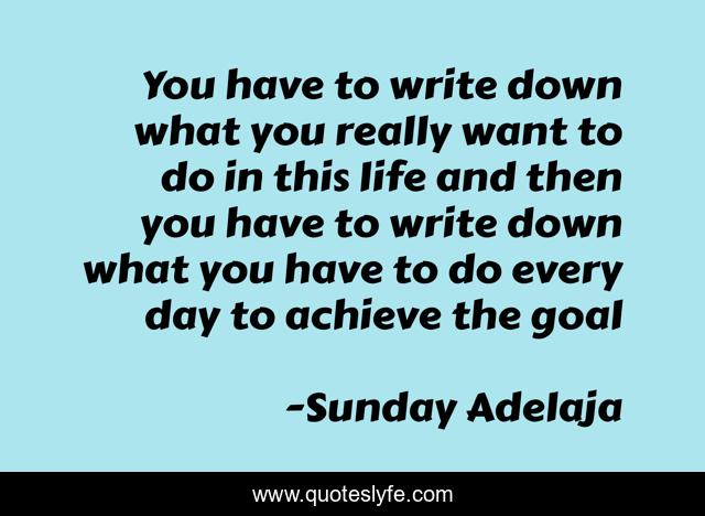 This page presents the quote "You have to write down what you really want to do in this life and then you have to write down what you have to do every day to achieve the goal". Author of this quote is Sunday Adelaja. This quote is about down, goal, mission, daily, calling, write, purpose, hobby, work-job,.