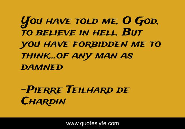 This page presents the quote "You have told me, O God, to believe in hell. But you have forbidden me to think...of any man as damned". Author of this quote is Pierre Teilhard de Chardin. .
