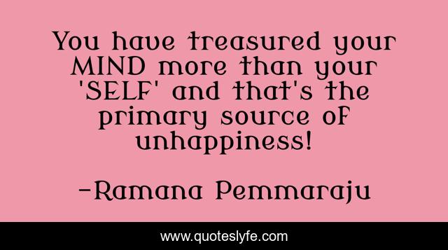 This page presents the quote "You have treasured your MIND more than your 'SELF' and that's the primary source of unhappiness!". Author of this quote is Ramana Pemmaraju. This quote is about self-confidence, mindfulness, self-improvement-book, self-realization, state-of-no-mind, self-improvement, self-motivation, self-awareness,.