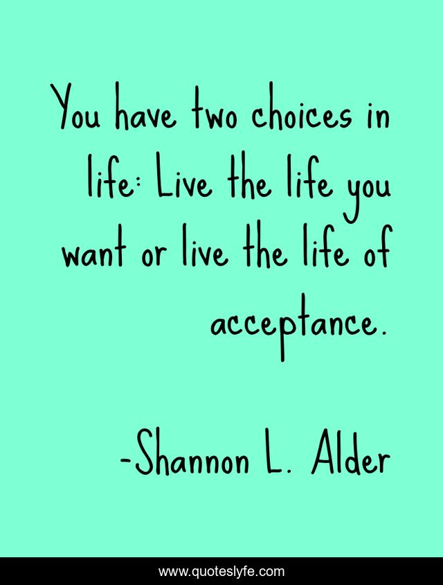 This page presents the quote "You have two choices in life: Live the life you want or live the life of acceptance.". Author of this quote is Shannon L. Alder. This quote is about life, acceptance, choices,.
