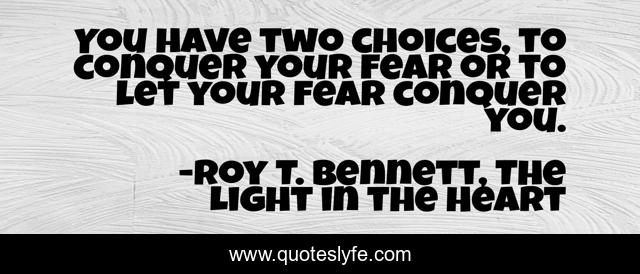 This page presents the quote "You have two choices, to conquer your fear or to let your fear conquer you.". Author of this quote is Roy T. Bennett, The Light in the Heart. This quote is about motivation, inspire, optimistic, inspirational-life, fear, life-and-living, living, inspiring, positive,.