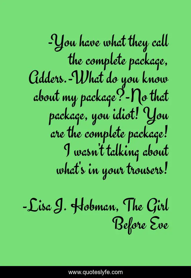 This page presents the quote "-You have what they call the complete package, Adders.-What do you know about my package?-No that package, you idiot! You are the complete package! I wasn't talking about what's in your trousers!". Author of this quote is Lisa J. Hobman, The Girl Before Eve. .