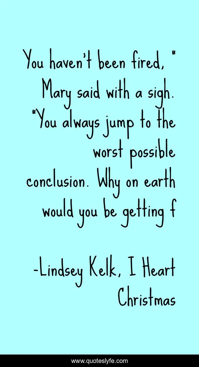 This page presents the quote "You haven't been fired, " Mary said with a sigh. "You always jump to the worst possible conclusion. Why on earth would you be getting f". Author of this quote is Lindsey Kelk, I Heart Christmas. This quote is about funny, humor, humour, relateable, comedy, chicklit,.