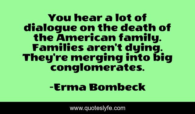 This page presents the quote "You hear a lot of dialogue on the death of the American family. Families aren't dying. They're merging into big conglomerates.". Author of this quote is Erma Bombeck. .