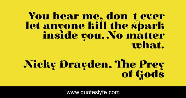 This page presents the quote "You hear me, don't ever let anyone kill the spark inside you. No matter what.". Author of this quote is Nicky Drayden, The Prey of Gods. .