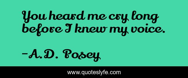 This page presents the quote "You heard me cry long before I knew my voice.". Author of this quote is A.D. Posey. This quote is about women-wisdom, authors-life, love, laugh, writers-life, light, energy, cry, peace,.
