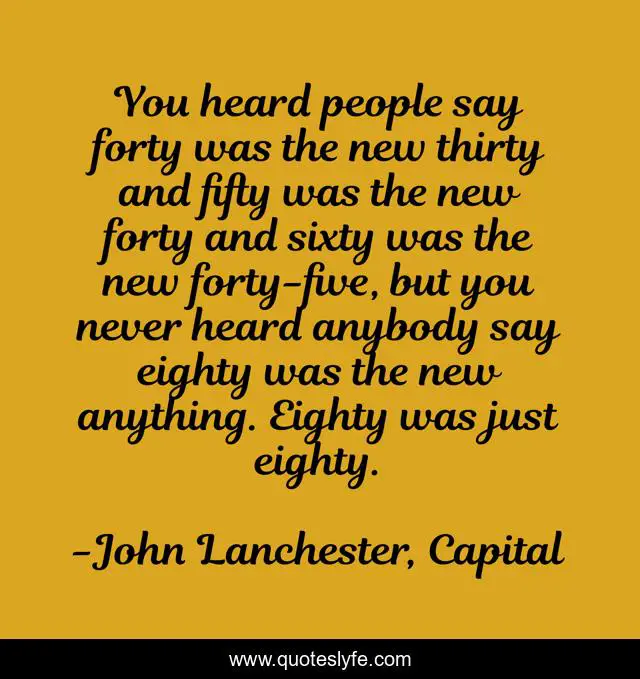 This page presents the quote "You heard people say forty was the new thirty and fifty was the new forty and sixty was the new forty-five, but you never heard anybody say eighty was the new anything. Eighty was just eighty.". Author of this quote is John Lanchester, Capital. This quote is about aging, denial,.