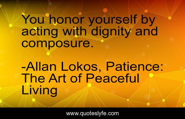 This page presents the quote "You honor yourself by acting with dignity and composure.". Author of this quote is Allan Lokos, Patience: The Art of Peaceful Living. This quote is about compassion, culture, ethics, education, meditation, inspiration,.