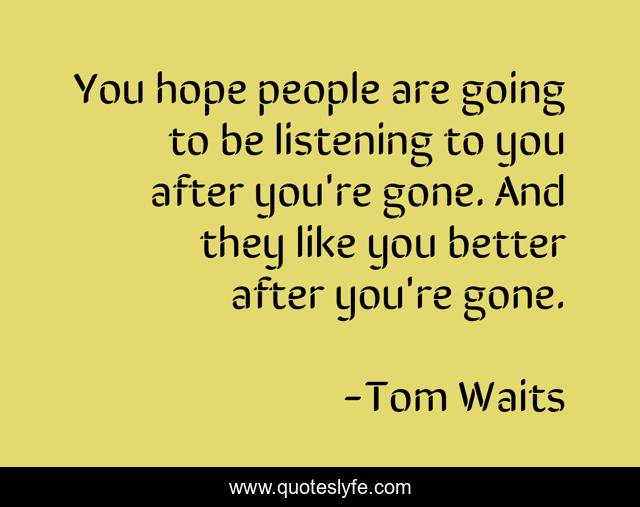 This page presents the quote "You hope people are going to be listening to you after you're gone. And they like you better after you're gone.". Author of this quote is Tom Waits. This quote is about better, listening, people,.