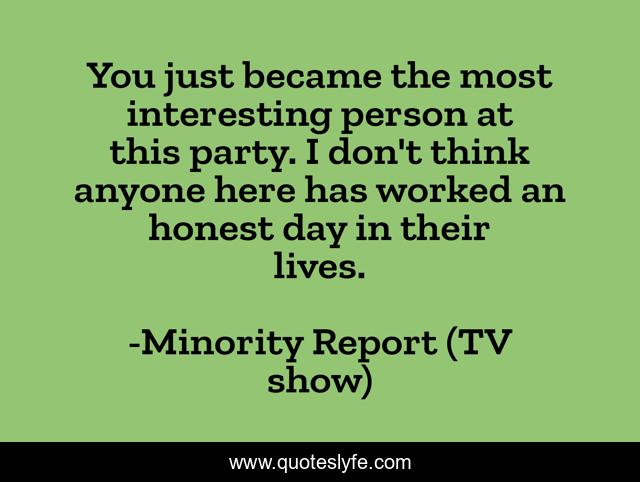 This page presents the quote "You just became the most interesting person at this party. I don't think anyone here has worked an honest day in their lives.". Author of this quote is Minority Report (TV show). This quote is about laziness, vocation, passion, calling,.