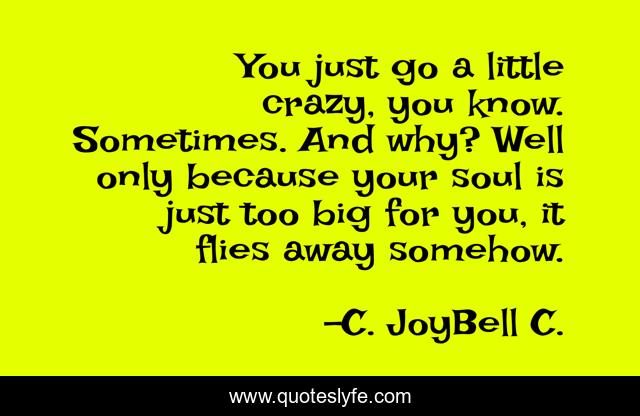 This page presents the quote "You just go a little crazy, you know. Sometimes. And why? Well only because your soul is just too big for you, it flies away somehow.". Author of this quote is C. JoyBell C.. This quote is about being-human, going-crazy, inspirational, inspirational-life, enthusiasm, the-human-experience,.