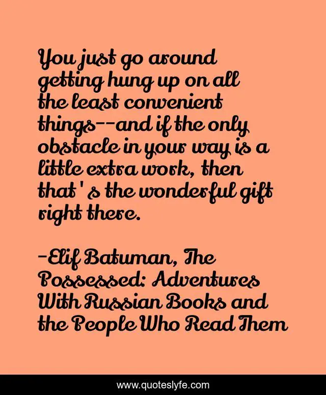This page presents the quote "You just go around getting hung up on all the least convenient things--and if the only obstacle in your way is a little extra work, then that's the wonderful gift right there.". Author of this quote is Elif Batuman, The Possessed: Adventures With Russian Books and the People Who Read Them. .