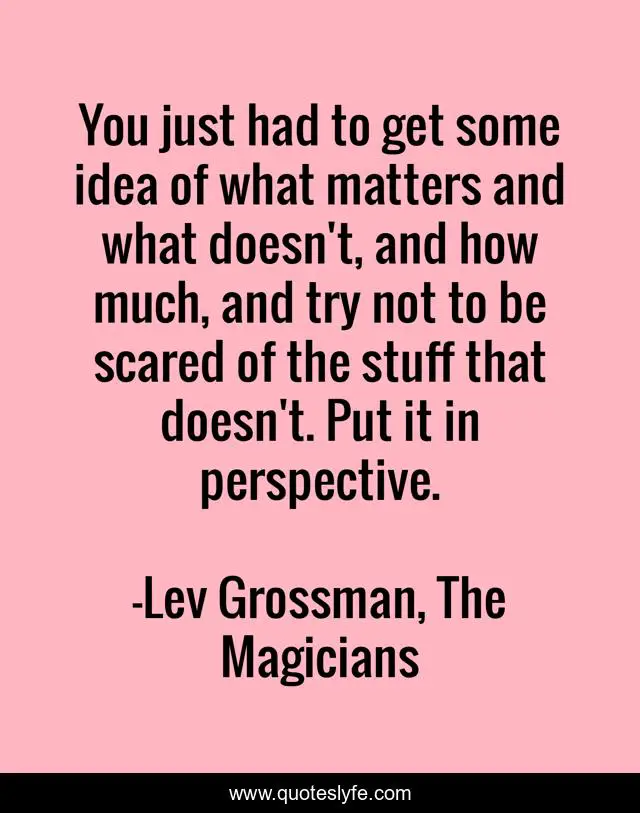 This page presents the quote "You just had to get some idea of what matters and what doesn't, and how much, and try not to be scared of the stuff that doesn't. Put it in perspective.". Author of this quote is Lev Grossman, The Magicians. This quote is about importance, life, perspective, significance,.